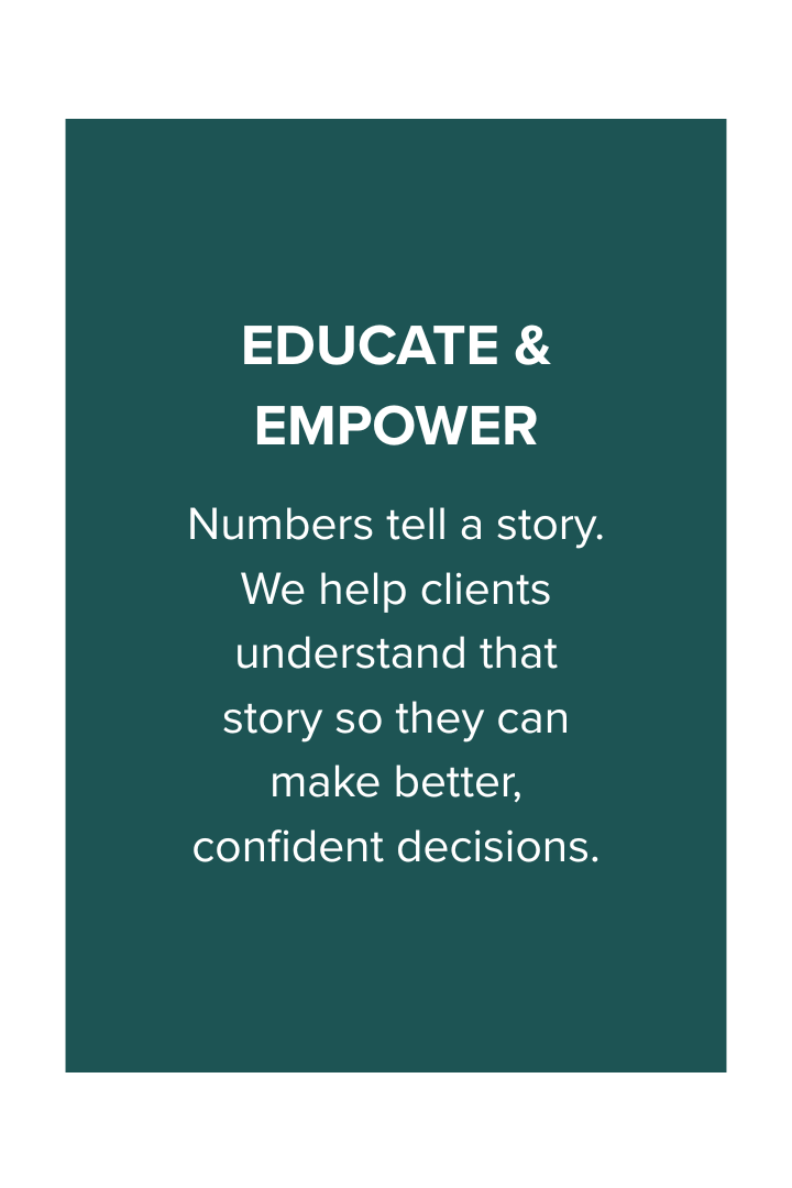 Our vision is to redefine what a tax and accounting partner looks like—one built on trust, character, proactive strategy, and an unwavering commitment to elevate everyone we serve. We are committed to solving problems with excellence, continually growing our expertise, and delivering personalized guidance that puts our clients’ best interests at the center of everything we do. We take time to understand, explore, and create with purpose at every turn.